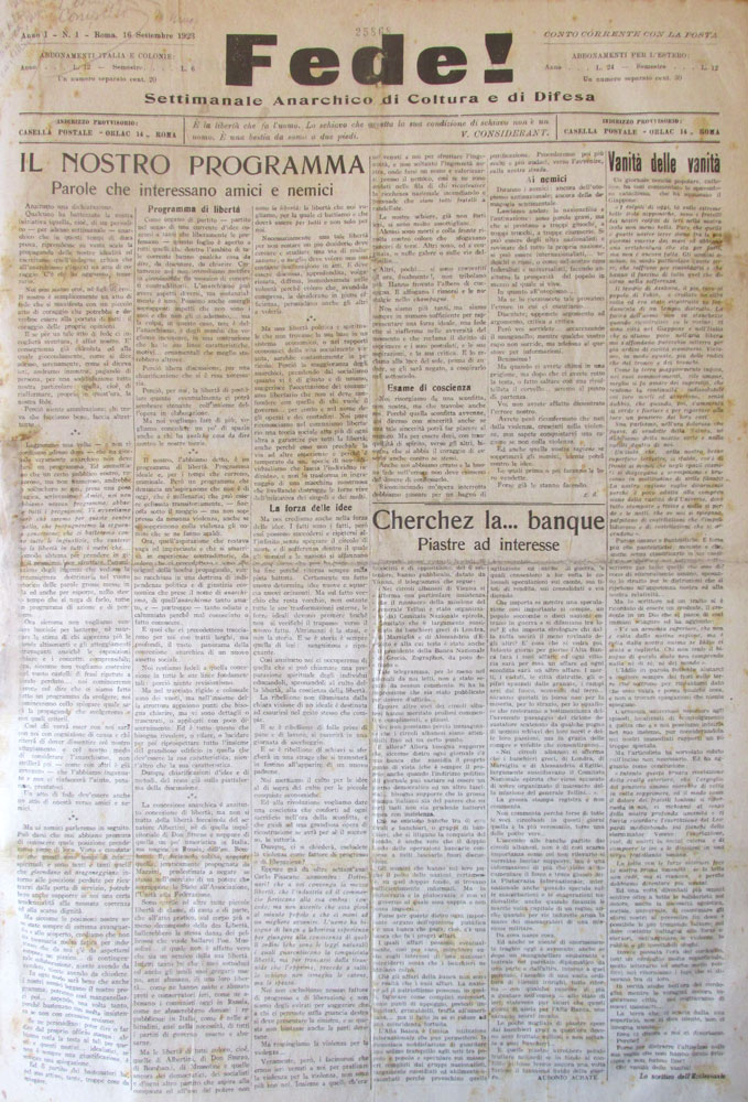 cop. di «Fede! : settimanale anarchico di coltura e di difesa», anno 1, n. 1 (16 settembre 1923)