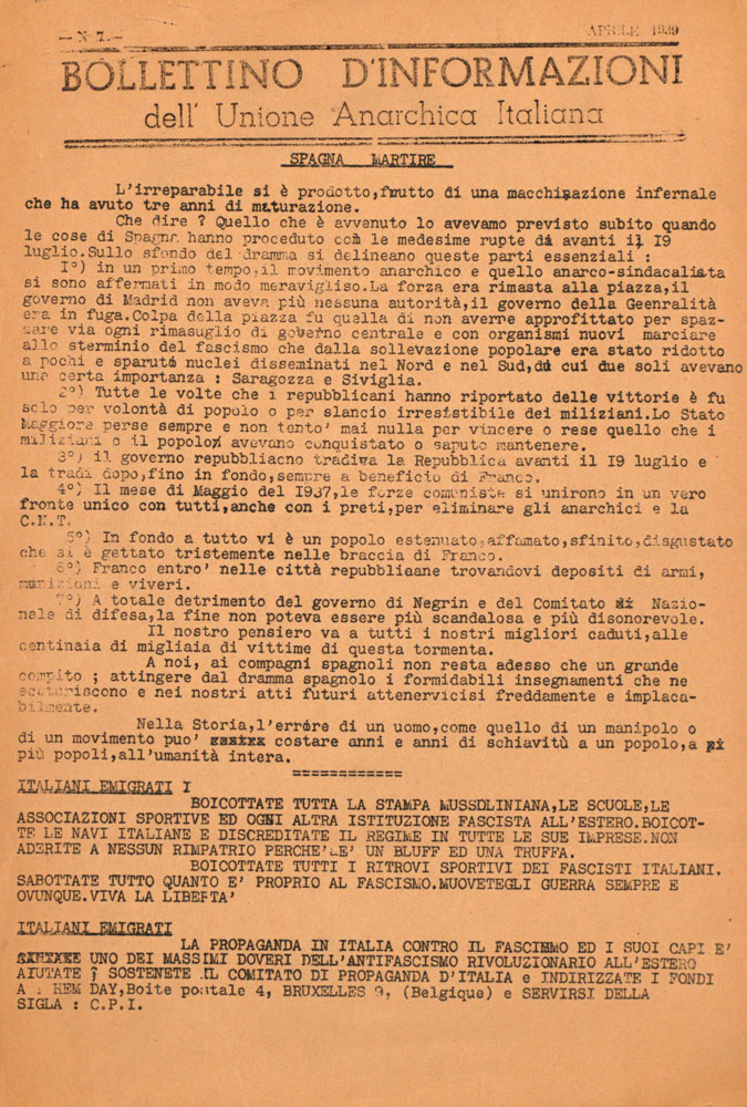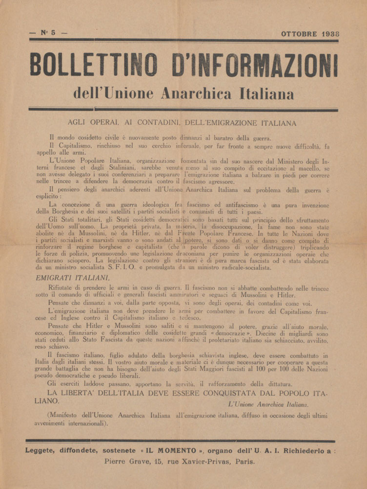 L’avvertimento a non confidare su possibili interventi militari contro il fascismo da parte di governi democratici, in quanto «la concezione di una guerra ideologica fra fascismo e antifascismo è una pura invenzione della Borghesia e dei suoi satelliti, i partiti socialisti e comunisti di tutti i paesi» e l’incitamento a liquidarlo piuttosto, sul terreno rivoluzionario, ricorrono ancora in altri due manifesti, pubblicati entrambi sul n. 5, dell’ott. 1938. Mentre nel primo (a firma «L’Unione Anarchica Italiana») si chiedeva Agli operai, ai contadini dell’emigrazione italiana di compiere opera di disfattismo rivoluzionario in caso di conflitto, nell’altro, che a firma del «Comitato di Propaganda d’Italia», si rivolgeva All’emigrazione italiana di tutto il mondo, s’invocava una chiara presa di coscienza «della vera situazione interna e dell’opera perturbatrice che il fascismo ha svolto nel quadro internazionale» e si proponevano, con invito ad attuarle, alcune forme di lotta antifascista: «Campagna di odio contro il regime, boicottaggio della stampa fascista, delle sue scuole e di tutte le istituzioni fasciste all’estero, campagna contro i suoi consolati e ambasciate … Boicottaggio delle navi e dei prodotti italiani in ogni porto, in ogni paese in tutte le parti del mondo. Discredito del regime in tutte le sue imprese economiche per la sua instabilità finanziaria e politica. Bollare senza pietà le democrazie vicine e lontane che trescano con il governo italiano, smascherando e denunciando tutti i patti passati e futuri, atti di tradimento alla civiltà ed al progresso. Impedire con qualunque mezzo il libero sviluppo di avvenimenti sportivi od altro, aventi un carattere internazionale dove il regime fascista sia presente».