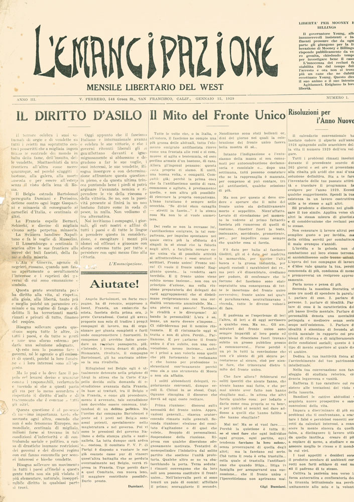 Nel 1932: L’Emancipazione : mensile libertario del West. Indirizzo V. Ferrero, Box 221. Fruitvale Station, Oakland, Cal.