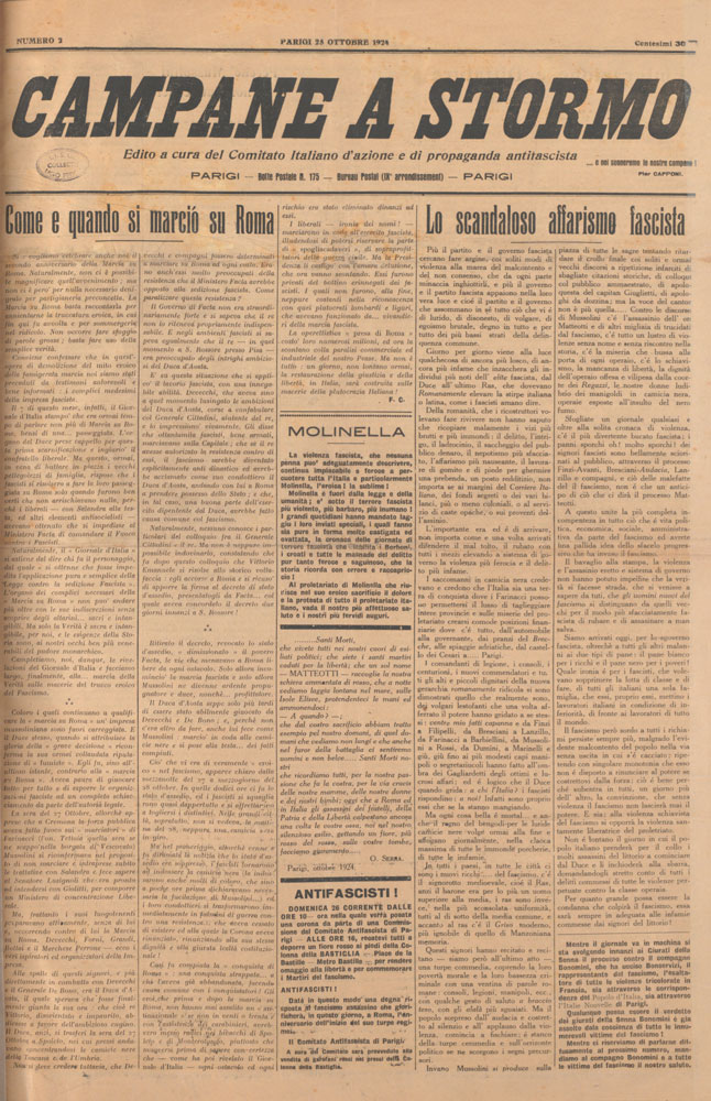 Nel giu. 1924, come si sparse la notizia del criminale attentato^a-Giacomo Matteotti, venne costituito a Parigi, un «Comitato d’Azione Antifascista», col concorso dei socialisti (rappresentati da F. Ciccotti; G. Salvi e E. Caporali), dei repubblicani (L. Campo- longhi e A. Natoli) e degli anarchici (A. Meschi, E. Abate, U. Fedeli e À. Borghi). Tra le iniziative prese dal Comitato antifascista rientrò appunto la pubblicazione di Campane a Stormo, la cui direzione era stata, in un primo tempo, affidata ad Alceste De Ambris. Questi, tuttavia, declinò l’incarico (assunto poi, dal socialista Ciccotti), ancor prima dell’uscita del giornale, onde evitare l’acuirsi di dissidi fra i membri promotori dell’iniziativa e A. Borghi, che non approvava «questo miscuglio» con esponenti della Lega dei Diritti dell’Uomo. Cf. A. Borghi, Mezzo secolo di anarchia, Napoli 1954, p. 313; H. Rolland [E. Abate], Il sindacalismo anarchico di A. Meschi, Firenze 1972, p. 183 e nota 18.